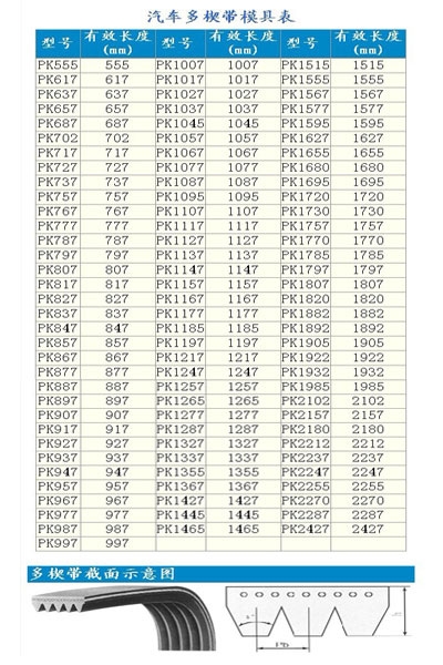 我公司主產(chǎn)的汽車多楔帶按照使用材料主要分為氯丁橡膠多楔帶和三元乙丙橡膠多楔帶。